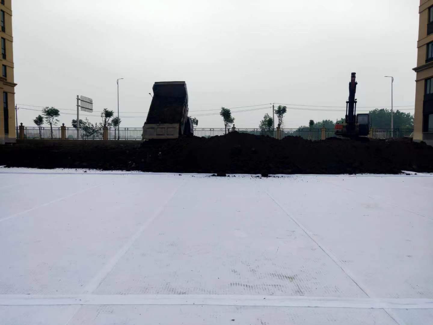 1、雨水或浇灌水经土壤层渗透至车库顶板高分子防护排水异形片。